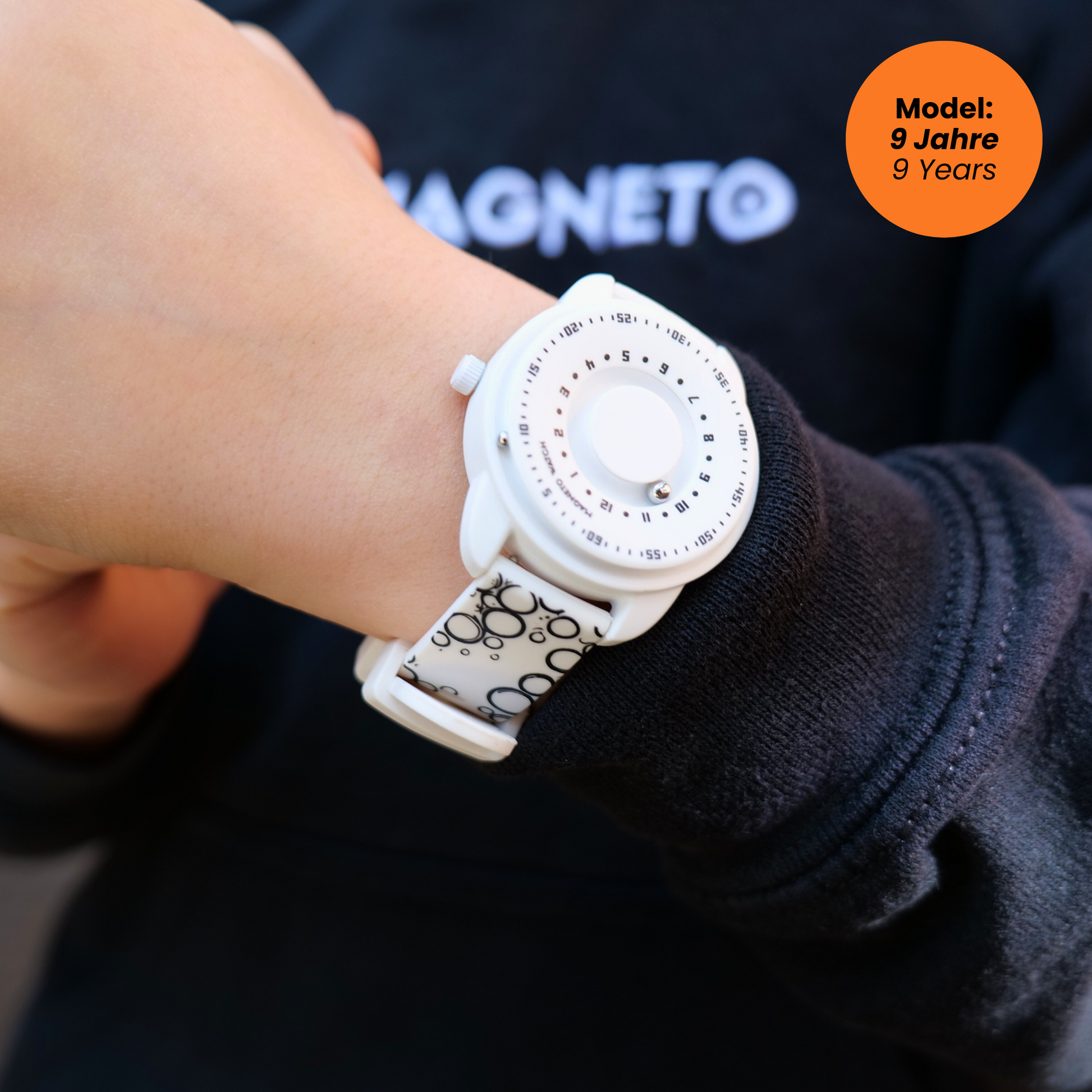 Bubbles White von Magneto Watch bringt frische Leichtigkeit an jedes Kinderhandgelenk. Statt herkömmlicher Uhrzeiger sorgen hier zwei Magnetkugeln – eine größere Innenkugel für die Stunden und eine kleinere Außenkugel für die Minuten – für ein außergewöhnliches Zeitablesen, das Kinder begeistert. Das hochwertige Kunststoffgehäuse (ABS) ist robust und dennoch angenehm leicht. Der Clou ist das weiße Silikonarmband mit blasenartigem Print, das an Seifenblasen erinnert und perfekt zum Namen „Bubbles“ passt. So wird das Erlernen der Uhrzeit zum spannenden Erlebnis – inklusive einem frischen, coolen Look am Handgelenk.