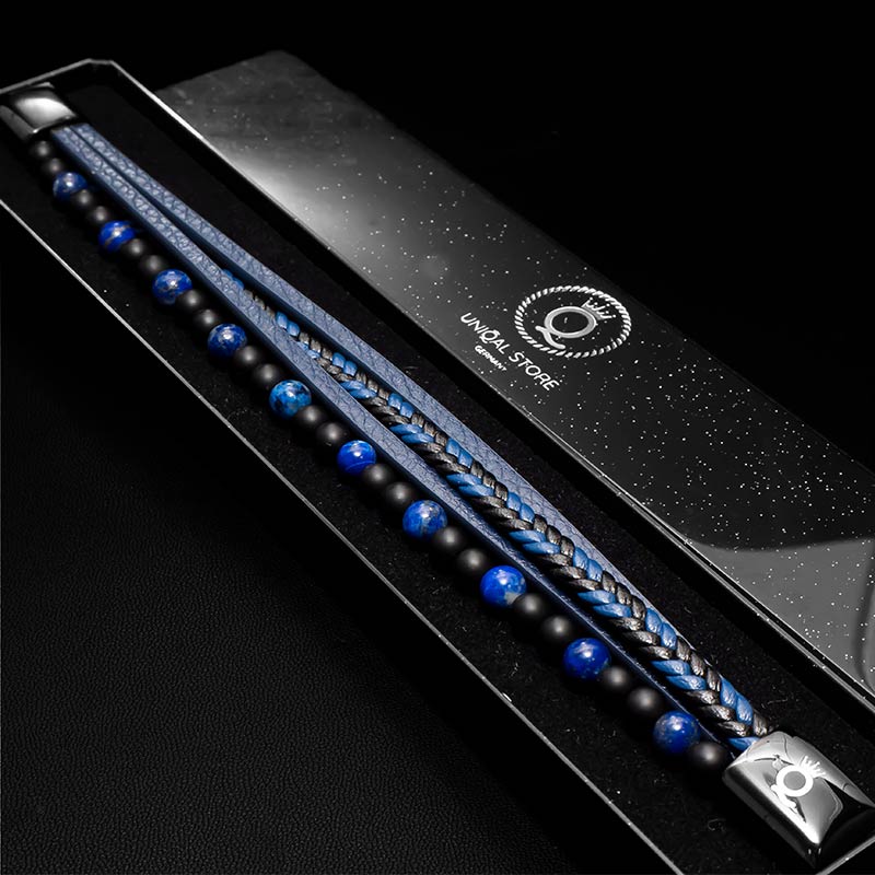 Das Armband besteht aus drei Strängen, von denen einer kunstvoll geflochten ist, während die anderen Stränge die leuchtenden Lapis Lazuli Perlen und die eleganten schwarzen Perlen präsentieren. Lapis Lazuli, ein Naturstein von großer spiritueller Bedeutung, steht symbolisch für Weisheit, Kreativität und innere Ruhe. Es wird gesagt, dass er positive Energie fördert und Harmonie in das Leben seines Trägers bringt.