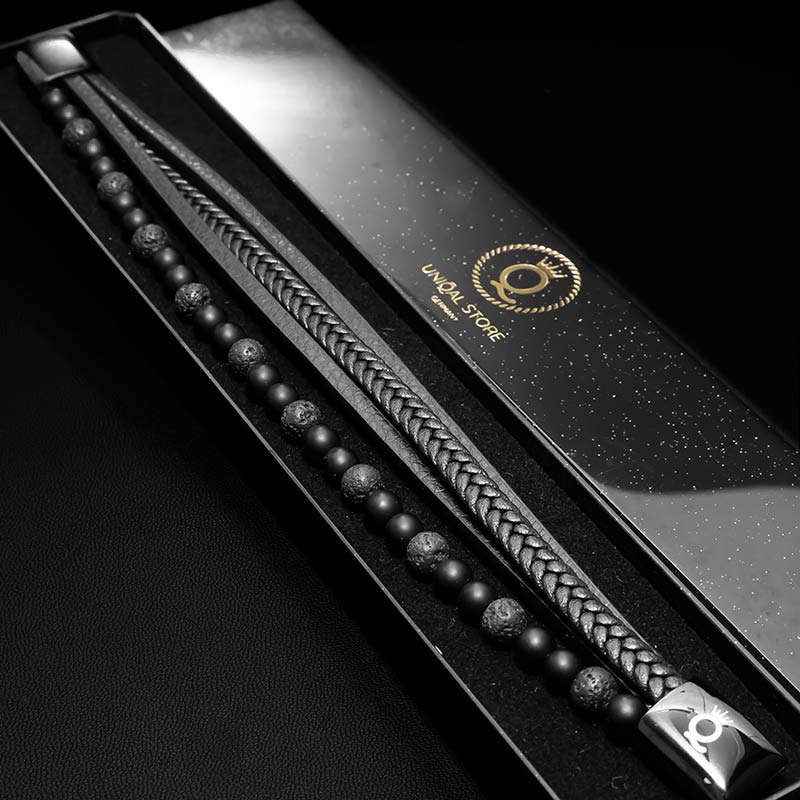 Entdecken Sie die faszinierende Welt des "FANCY LAVA" Lederarmbands für Herren in unserem exklusiven Online-Shop. Dieses einzigartige Armband kombiniert echtes schwarzes Rindleder mit der intensiven Schönheit von Lava Steinen, die entlang der drei Stränge kunstvoll integriert sind.