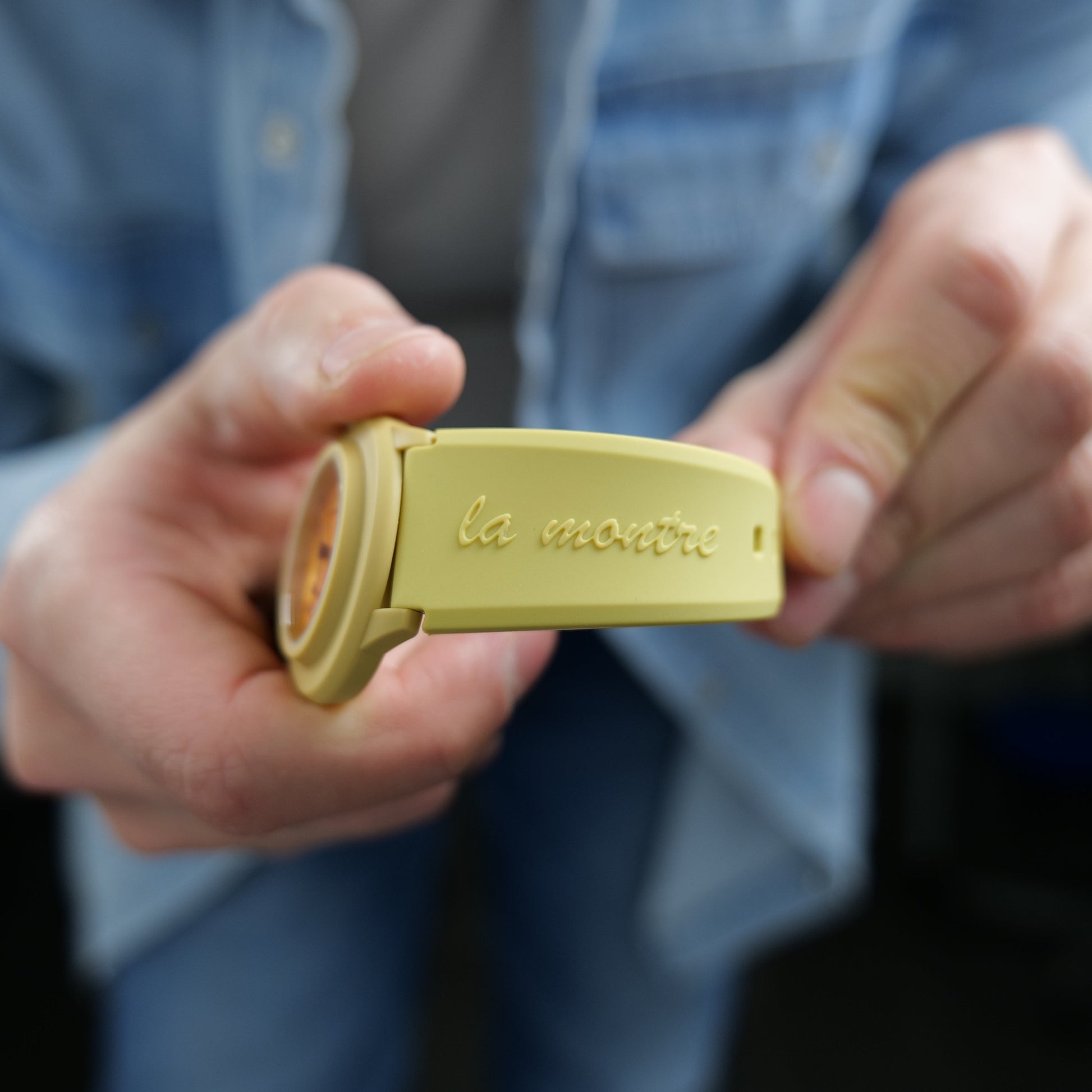 Ein besonderes Highlight ist die Datumsanzeige zwischen 10 und 11 Uhr – eine ungewöhnliche Position, die Blicke auf sich zieht und für Gesprächsstoff sorgt. Dazu harmoniert das rundgebürstete Aluminium-Zifferblatt, das dezente Lichtreflexe erzeugt. Komplettiert wird der Look durch das gelbe Silikonarmband mit erhabener „La Montre“-Prägung und Dornverschluss, das für hohen Tragekomfort sorgt.