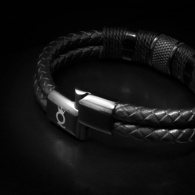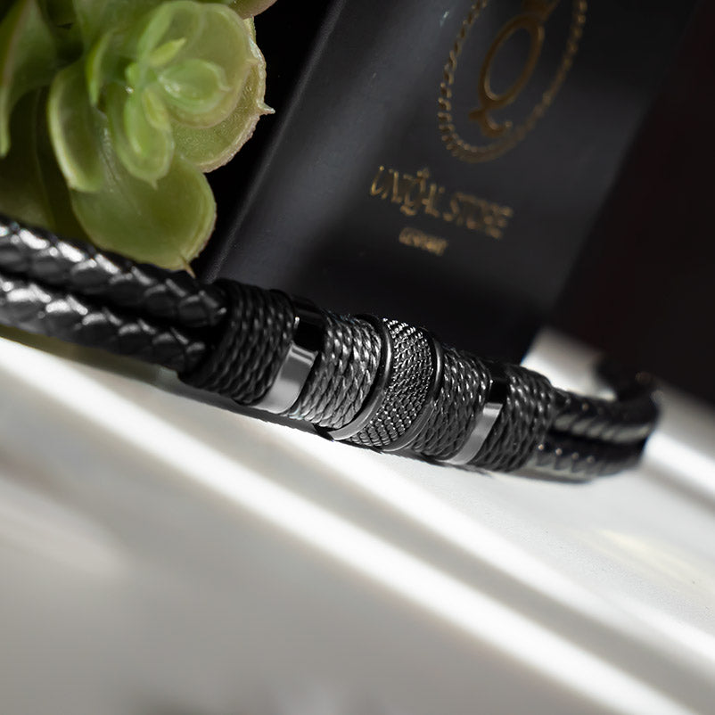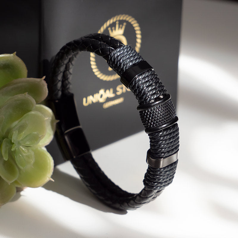 Eintauchen in eine Welt, in der Eleganz auf Bedeutung trifft – das ist das "PREMIUM STYLE BLACK" Armband. Kunstvoll gefertigt mit zwei Strängen aus echtem Leder, die sich harmonisch nebeneinander schmiegen, wird dieses Accessoire zum unverzichtbaren Begleiter des modernen Mannes.