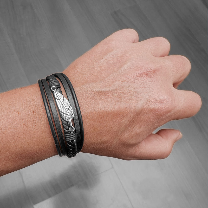 Eintauchen in die Welt des schimmernden Silbers, wo Eleganz auf Geschichte trifft. Das "SILVER FEATHER" Armband ist eine Hommage an jene Träume, die so leicht wie Federn sind, und doch tief in unseren Herzen verwurzelt bleiben. Bestehend aus fünf kunstvollen Strängen, hebt sich ein exquisit geflochtener Strang besonders hervor, auf welchem eine Feder aus silbernem Edelstahl ruht. Ein Symbol für Hoffnung, Freiheit und unendliche Möglichkeiten.