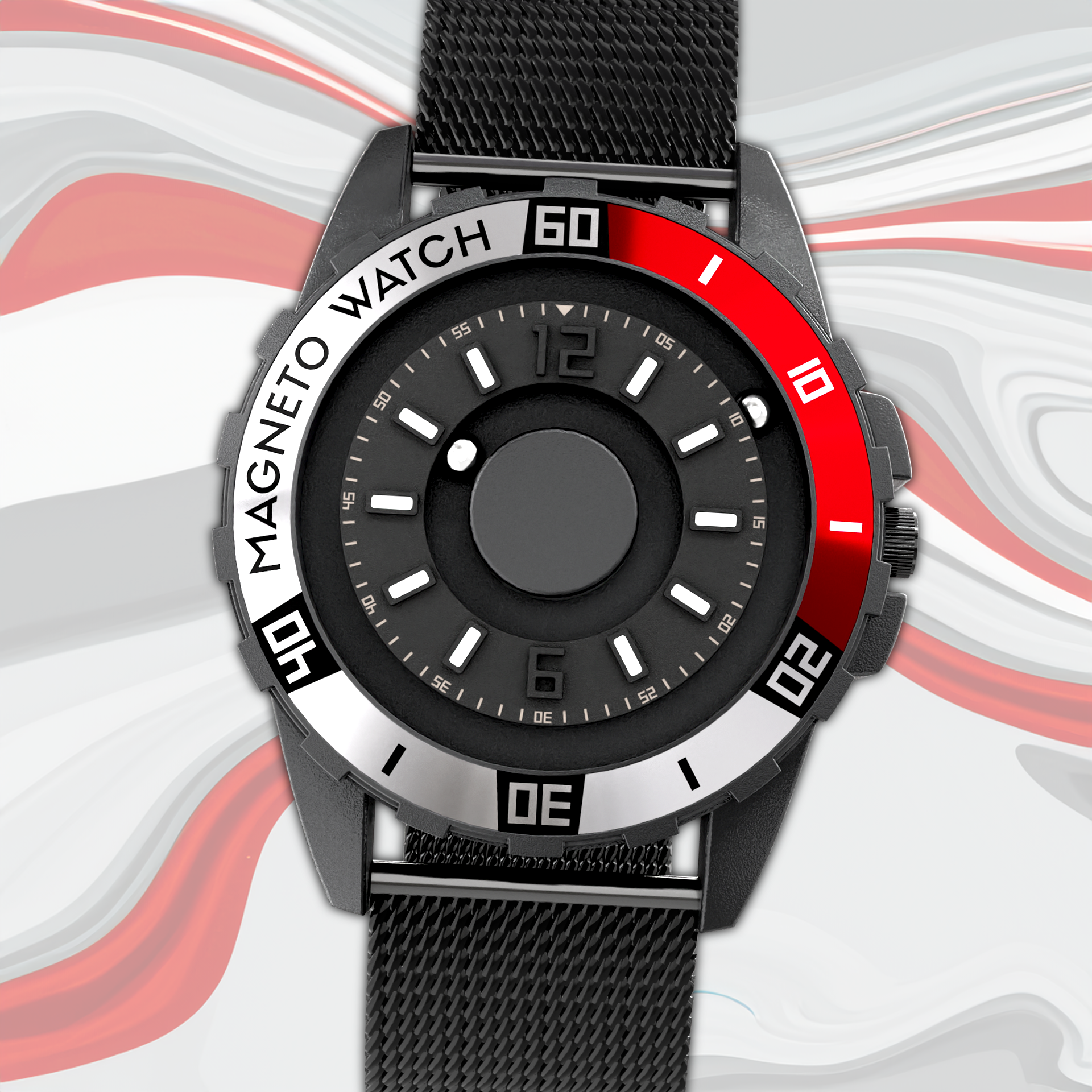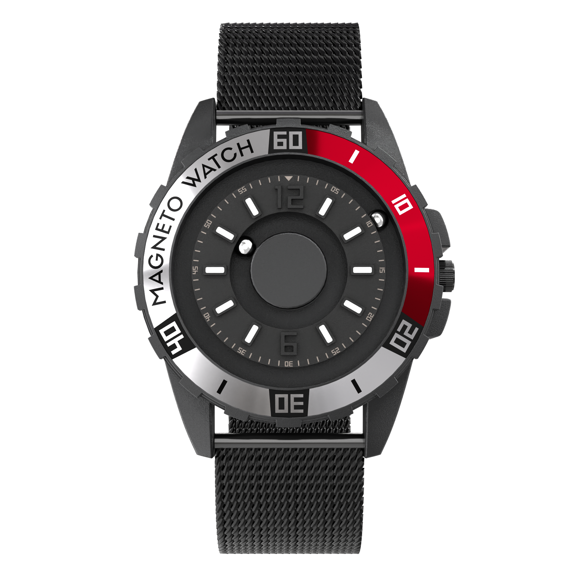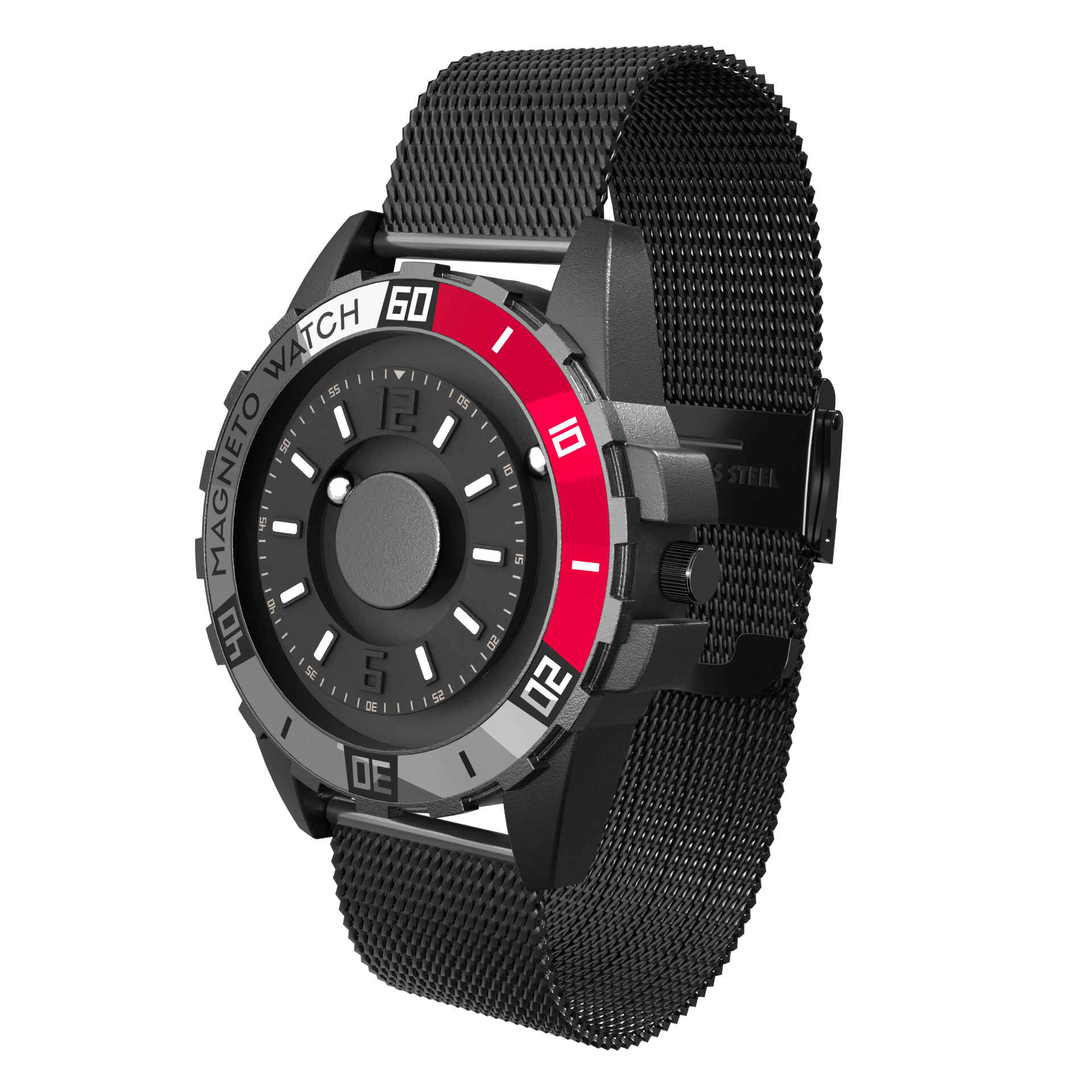 Die Uranus Black ist ein echter Blickfang: Mit ihrem schwarzfarbenen Gehäuse aus hochwertiger Alloy und dem rot-silbernen Zifferblatt zieht sie alle Blicke auf sich. Die innovative Magnetzeiger-Technik sorgt für eine moderne Zeitanzeige, während das schwarze Milanaisearmband einen eleganten und sportlichen Look verleiht. Gehäusedurchmesser: 40 mm, Gehäusehöhe: 13 mm. Für alle, die mutiges Design und technische Raffinesse schätzen.